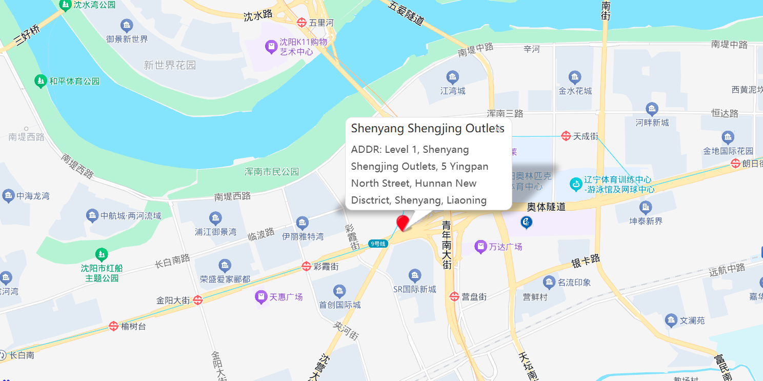 地址:Level 1, Shenyang Shengjing Outlets, 5 Yingpan North Street, Hunnan New Disctrict, Shenyang, Liaoning