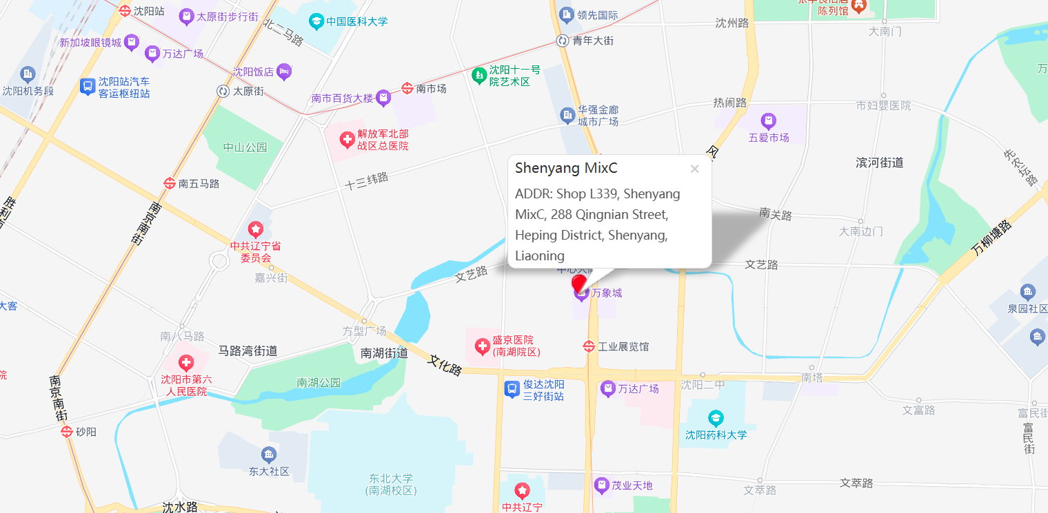地址:Shop L339, Shenyang MixC, 288 Qingnian Street, Heping District, Shenyang, Liaoning